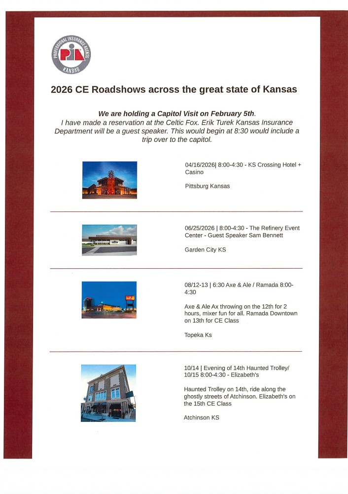 Kanas PIA is hosting its 2026 CE Roadshows across Kansas. There are 4 CE events being held between February 5, 2026, through October 15, 2026, across Kansas. Please reach out to Vonda Copeland at vonda@copelandins.com or at 785-232-4143 for more details.